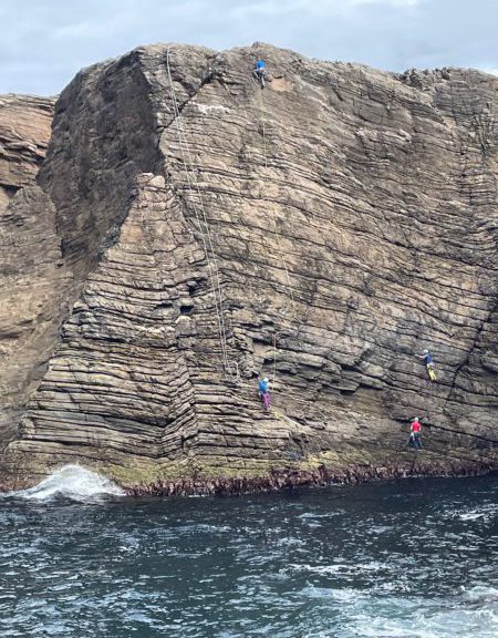 June 28 Tory Island trip gathered a dozen of all ages! It started with a gut wrenching  crossing. Bike-towed gear bags & a great camp spot on a NW cliff with handy beach & resident seal present all weekend. Jack & Lisa joined with their youngsters. Top entertainment came from boy band Pol, Paul & Alan. A new route put up by Alan, Tinneas Na Mara. Also sea dips and hikes around & the stunning spur of AnEochair Mhor.